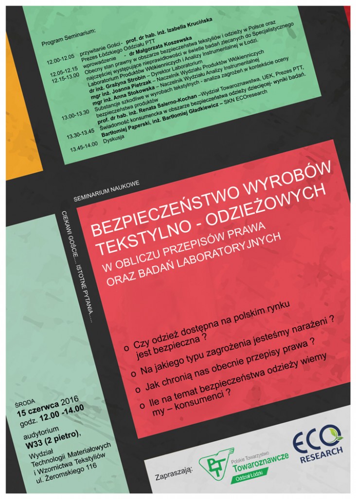 SEMINARIUM NAUKOWE "BEZPIECZEŃSTWO WYROBÓW TEKSTYLNO-ODZIEŻOWYCH W OBLICZU PRZEPISÓW PRAWA ORAZ BADAŃ LABORATORYJNYCH"