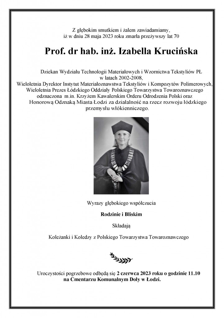 Profesor Izabella Krucińska była wzorem rzetelnej postawy naukowej i pasji badawczej, realizowanej z oddaniem dla dobra naszej Uczelni.