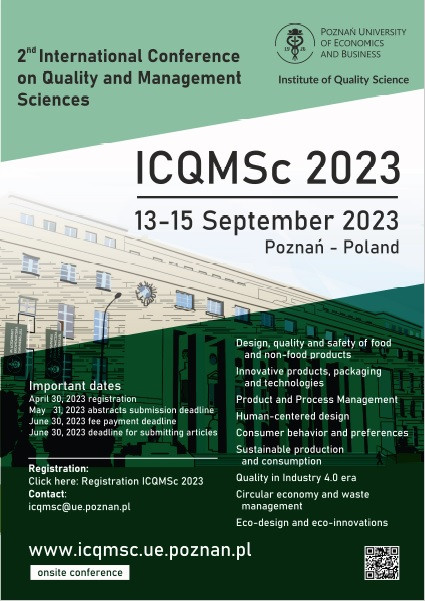 the Institute of Quality Science of Poznań University of Economics and Business has a great honor to invite you to take part in the 2nd International Conference on Quality and Management Sciences 2023 (2nd ICQMSc 2023) to be held onsite from 13 to 15 September 2023 in Poznań, Poland, at the historical main building of PUEB.